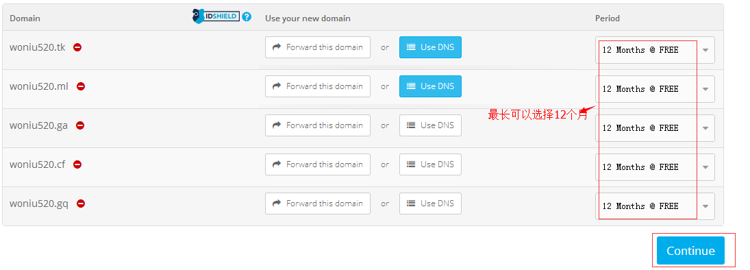 3、进入购物车后,我们选择域名期限,免费的最长为1年。全部选择好后点击”Continue“进入下一步。
