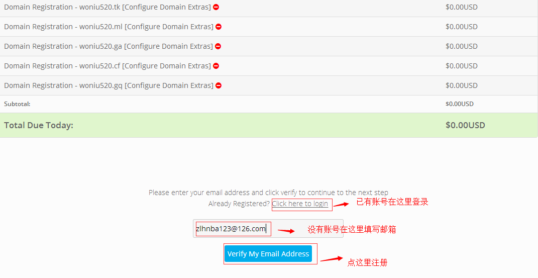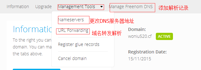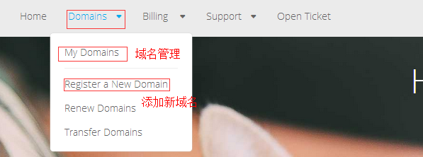8、完成注册后,我们登录账号,账号是你的邮箱,密码是你刚才注册的。登录后,我们点击如下图位置,我们点击”My Domins“进入到域名管理。如果你需注册新域名的话请点击”Register a New Domain“