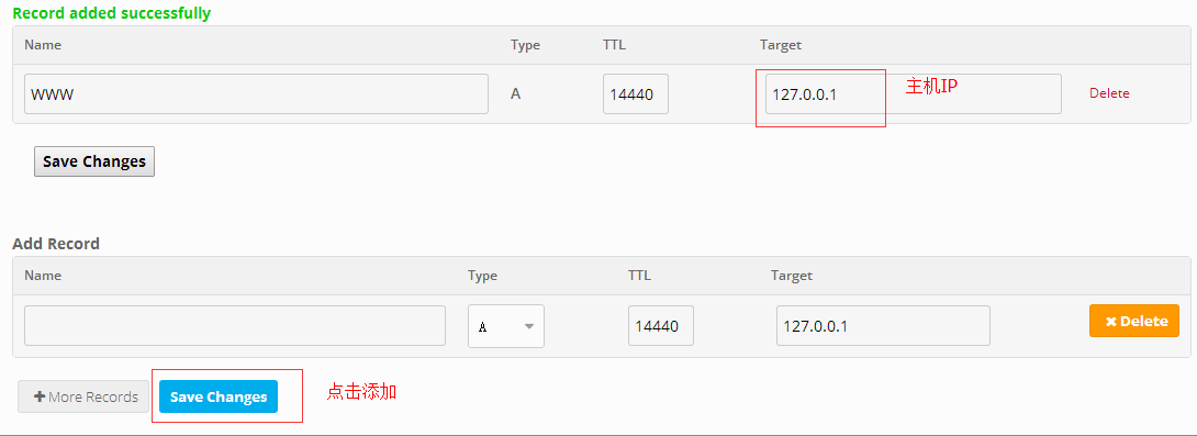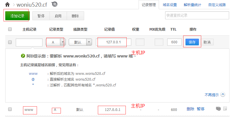 这个就是添加解析的页面。一般做两个解析记录,一个带www,一个不带。解析好后,再到主机商控制面板添加绑定域名即可。