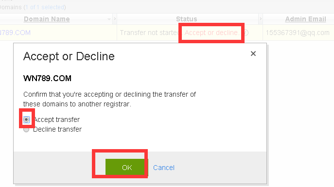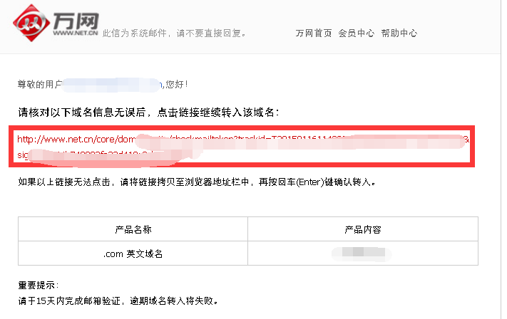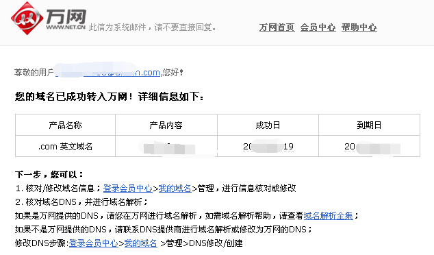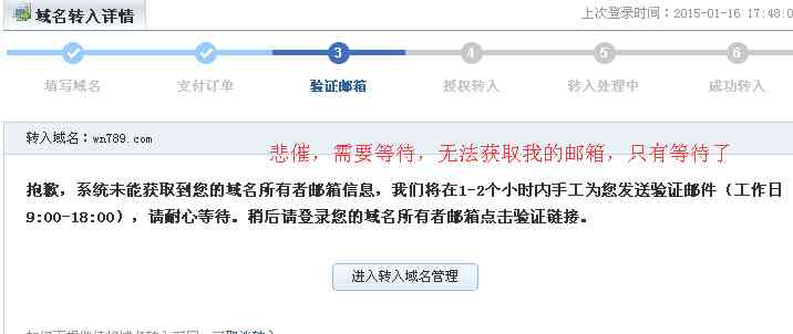 确认之后,就等待万网给你发邮件提示域名转入成功。