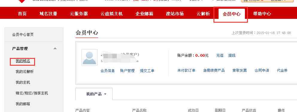 关于怎么付费,就不多说了,这个根据自己选择,可以是支付宝,也可以网银。支付完成后,我们登陆到万网,点击会有中小,然后选择做出的“我的域名”