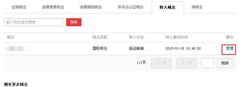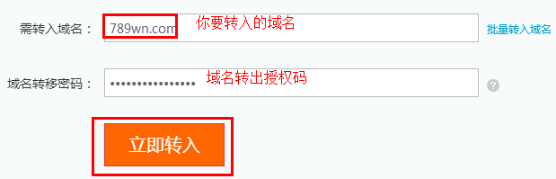 好的,域名转出的第一步我们就完成了,这一步,不管把你的域名转到哪里都是通用的。下面我们就要到域名转入商进行操作了。主机玖玖免费资源网这里以转入阿里云万网为例。其实还有关于域名的转入转出,根据不同的注册商,有不同的限制,比如到期的域名不能转出,才续费7天或30天内的域名不能转出,转入商有的也有限制,比如阿里云万网就对60天内刚进行过转入转出的域名不允许转入,所有转入转出前一定要把这些东西看清楚。