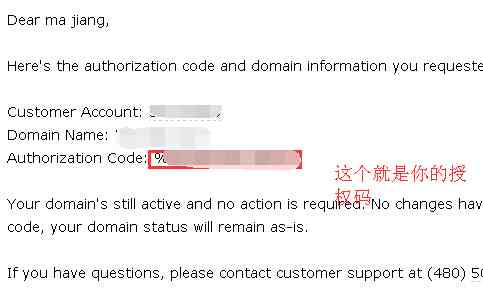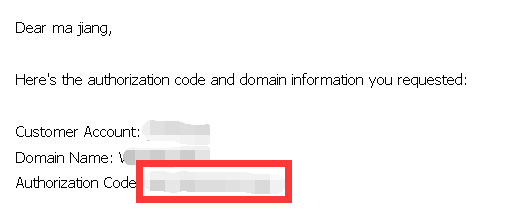 点击“Send”发送域名转出码后,我们打开邮箱,在邮件里可以查看到转出授权码。