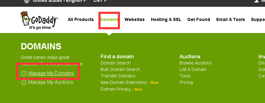 填写好后我们打开Godaddy官网,登陆你的账户,然后按下图操作,进入到域名管理页面: