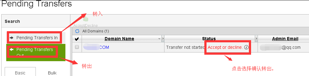 选择转出的域名管理,并点击红色字体位置,选择确认转出: