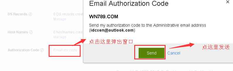 接着上面的教程来,我们现在获取域名转出码,我们点击Email my code,然后,点击“Send”发送域名转出码到你的域名注册邮箱。