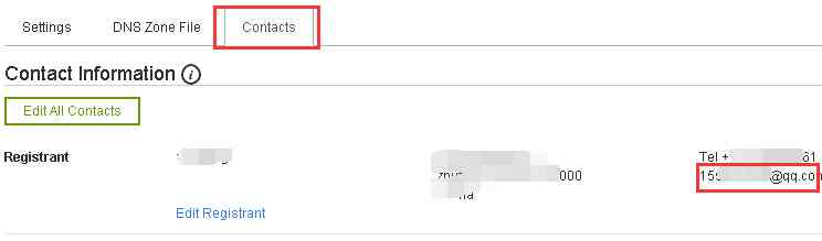 补充说明:如果你不知道你的域名注册邮箱,可按下面操作查看,如果你原注册邮箱没有使用了,也可以自己更改,如果要更改邮箱,点击“Edit Registrant”进入到管理页面,在邮箱位置修改即可,一共有4个要修改哦。(知道邮箱,不要更改的直接跳过这一步,继续看下一步教程)